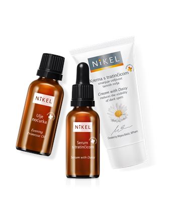 Tako za pojavu tamnih mrlja možete koristiti NiKEL Kremu s tratinčicom koja smanjuje vidljivost tamnih mrlja, ali i bora. Krema ne istanjuje kožu već poboljšava njenu teksturu. Djeluje sinergijski, od pripreme kože za optimalno upijanje tvari, preventivnog djelovanja na pigmentaciju do zaštite od vanjskih utjecaja koji potiču hiperpigmentaciju.